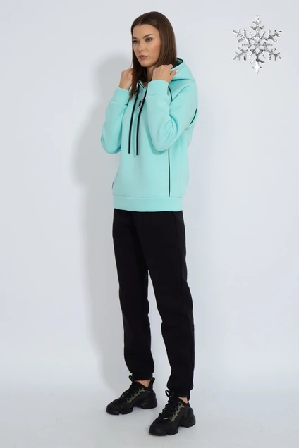 Костюм утепленный на флисе. Худи с рукавом реглан с капюшоном на подкладке из основной ткани, элементы обработки кантом. Брюки модели 4053 средней посадки зауженные к низу с карманами в боковых швах. Обработка низа брюк резинка. Ткань футер (3-х ниточный) с внутренним слоем утепленным начесом, качество Пенье, плотность 380 г.м2