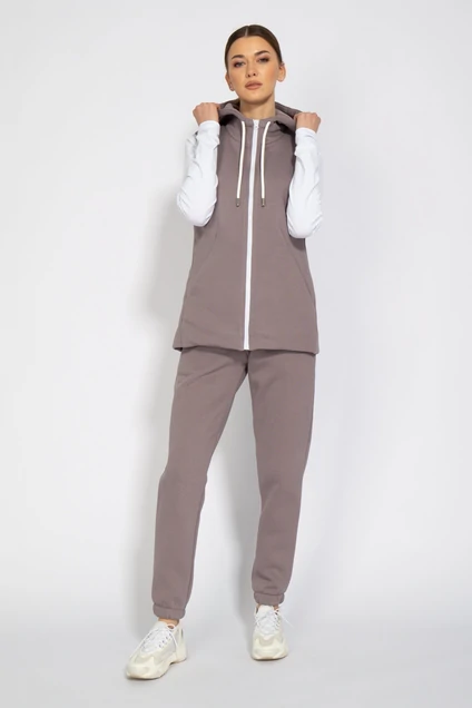 Костюм утепленный на флисе. Жилетка из футера с начесом на подкладке из натурального хлопка модели 4060 с капюшоном, с карманами. Брюки модели 4053 средней посадки зауженные к низу с карманами в боковых швах. Обработка низа брюк резинка. Ткань футер (3-х ниточный) с внутренним слоем утепленным начесом, качество Пенье, плотность 395 г.м2