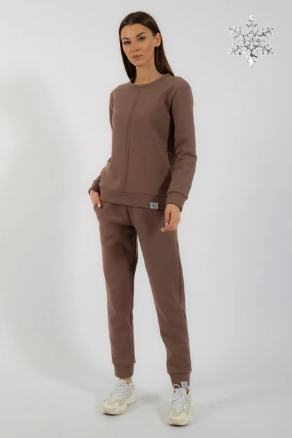 Костюм утепленный на флисе. Свитшот с принтом либо отделкой по переду. Брюки модели средней посадки зауженные к низу с карманами в боковых швах. Обработка низа брюк манжета. Ткань футер (3-х ниточный) с внутренним слоем утепленным начесом, качество Пенье, плотность 380 г.м2