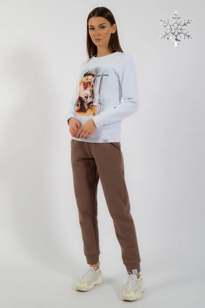 Костюм утепленный на флисе. Свитшот с принтом либо отделкой по переду. Брюки модели средней посадки зауженные к низу с карманами в боковых швах. Обработка низа брюк манжета. Ткань футер (3-х ниточный) с внутренним слоем утепленным начесом, качество Пенье, плотность 380 г.м2