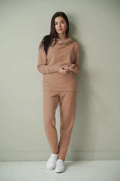 Основными принципами спортивного стиля является одежда не сковывающая движения, она удобна, красива и универсальна. Такая одежда уместна в самых разных ситуациях. В такой одежде девушка проводит немало времени, поэтому все вещи должны расковывать движения и позволять чувствовать себя комфортно на протяжении всего дня. Костюм выполнен из трикотажного полотна. По центру полочки декоративная печать. Карман "кенгуру". Шов стачивания верха и ниха полочки, а также вход в карман декоратированы строчкой на распошивалке. Капюшон на подкладке, застёгивается на молнию по косой. Рукав рубашечный, манжета из трикотажной резинки. Низ свитшота на притачном поясе. Брюки заужены к низу, карманы в боковом шве. По низу задней половинки брюк вставка из трикотажной резинки. Пояс брюк на резинке. Фурнитура может отличаться от фото.