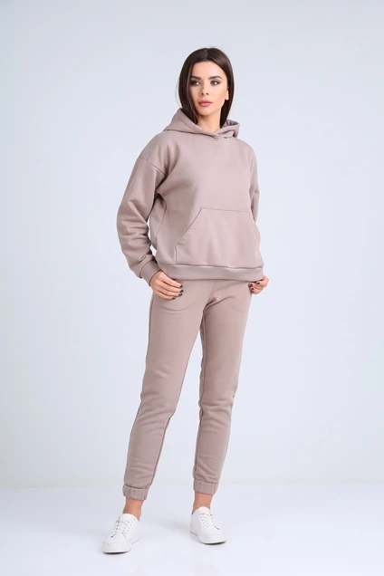 Костюм для повседневной носки из хлопкового полотна Футер-без начёса.Толстовка свободного покроя с капюшёном, плечо приспущено, рукав свободный. Впереди настрачной карман.Манжет и пояс притачные из довяза (кашкорсе) Брюки полуприлегающего силуэта. В боковых швах выполнены функциональные карманы. Низ брюк застрочен широким швом, в который вложена эластичная тесьма шириной 3,5см .Пояс притачной из основного полотна. Пояс на резинке шириной 4см. В поясе две прорезные петли, через которые продет шнур.