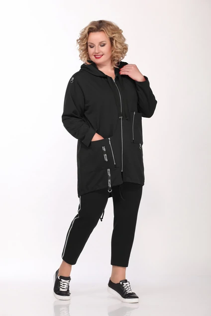 Брючный костюм в спортивном стиле выполнен из трикотажного полотна-двунитка. Куртка удлиненная свободного силуэта с капюшоном, рукав на спущенной пройме, по полочке ассиметричные накладные карманы с множеством декоративных деталей (молния, полукольца, тесьма). Застежка молния. По низу куртки регулируемая кулиска. Брюки на резинке свободного силуэта , зауженные к низу ,по боковым швам декоративные лампасы. РР 52-56 длина куртки по среднему шву-86см, длина втачного рукава-57см, длина брюк по боковому шву- 91см. Р52- куртка: ширина по линии груди -64см, ширина плеча-16см, ширина спинки-50,5см, ширина рукава на уровне проймы -21,5см, обхват по бедрам - 128см, брюки: обхват по талии-83, обхват по бедрам-100см, ширина по низу -16см. Р54- куртка: ширина по линии груди -66см, ширина плеча-16см, ширина спинки-50,5см, ширина рукава на уровне проймы -22,5см, обхват по бедрам - 132см, брюки: обхват по талии-87,обхват по бедрам-104см, ширина по низу -16см. Р56 – куртка: ширина по линии груди -68см, ширина плеча-16см, ширина спинки-50.5см, ширина рукава на уровне проймы -23.5см, обхват по бедрам - 136см, брюки: обхват по талии-91см, обхват по бедрам-108, ширина по низу -16см.
