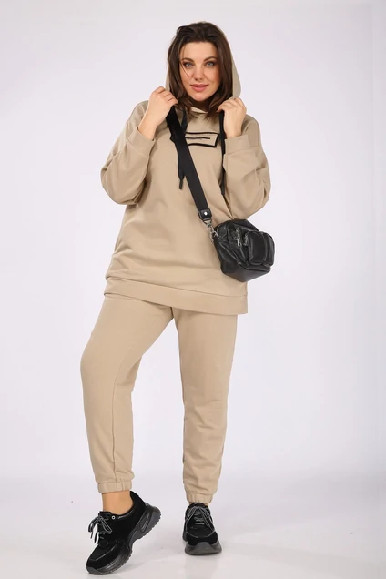 Спортивный костюм из трикотажного хлопкового полотна “трехнитка”. Удлинённый джепер-худи свободного силуэта с капюшоном и прорезными карманами в боковых швах, рукав втачной на спущенной пройме. Брюки свободного силуэта с прорезными карманами в боковых швах, пояс и низ на эластичной ленте со сборкой.