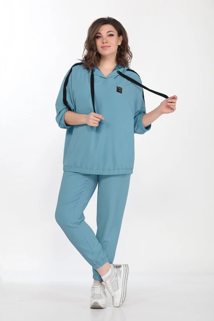 Мегаудобный, летний, костюм из легкой стрейчевой ткани с “Крэш” эффектом в спортивном стиле. Джемпер с капюшоном свободного силуэта, рукав втачной, укороченный, на спущенной пройме и эластичной манжете с регулировкой на подхват, По низу отрезная эластичная планка, в боковых швах карманы.