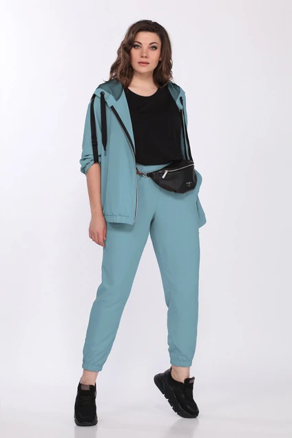 Летний костюм из легкой стрейчевой ткани с “Крэш” эффектом в спортивном стиле. Джемпер с капюшоном свободного силуэта, рукав втачной, укороченный, на спущенной пройме и эластичной манжете с регулировкой на подхват. Застежка на молнию, по низу отрезная эластичная планка, в боковых швах карманы.