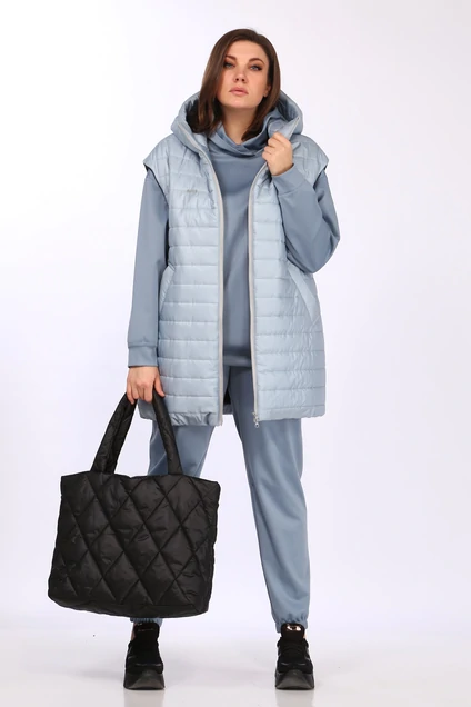 Стильный спортивный комплект тройка. Стильный Удлиненный стеганный жилет свободного силуэта с капюшоном, прорезные карманы с листочкой, по низу регулируемая кулиса. Утеплитель «FeelGood» 120 г./метр кв. Застежка молния.