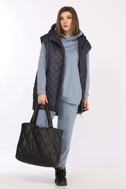 Стильный спортивный комплект тройка. Стильный Удлиненный стеганный жилет свободного силуэта с капюшоном, прорезные карманы с листочкой, по низу регулируемая кулиса. Утеплитель «FeelGood» 120 г./метр кв. Застежка молния.