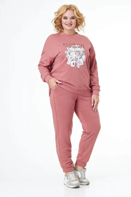 Комплект спортивного стиля из мягкого трикотажного полотна «футер 3-х нитка», состоящий из свитшота и брюк.Свитшот прямого силуэта со спущенной линией плеча. По переду и левому рукаву декоративный принт, рукава длинные с притачными манжетами из трикотажного полотна «рибана» в цвет основной ткани. Низ имеет фигурную линию, спинка длиннее полочки. Брюки на поясе с резинкой и наклонными карманами по переду, по низу брюк притачные манжеты из основной ткани. Длина свитшота по переду около 56/58 см, по спинке около 73/75 см, длина рукава+ плечо около 73 см; длина брюк по боковому шву с поясом около 102/104 см, по шаговому шву 72/74см