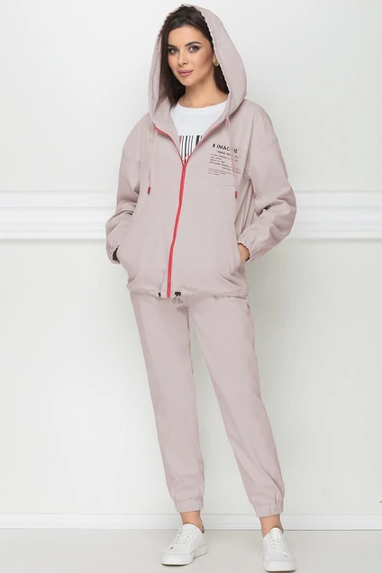 Комплект женский трехпредметный состоящий из жакета, брюк и джемпера. Жакет (куртка) прямого силуэта со спущенной линией плеча и капюшоном с декоративным шнуром. Рукав втачной длинный с резинкой по низу. По переду два функциональных прорезных кармана с листочкой и один накладной фигурный карман с декоративной печатью. Низ изделия регулируется фиксатором. Застежка бортовая на тесьму-молнию. Все швы декорированы контрастной х/б окантовкой. Брюки свободного силуэта на притачном поясе с резинкой. По передним половинкам функциональные карманы-хулиганы, по задним половинкам накладные карманы. Низ брюк на притачной манжете с резинкой. Джемпер прямого силуэта со спущенной линией плеча. Рукав втачной одношовный короткий. Вырез горловины с притачной планкой из основной ткани. По переду декоративный двухцветный принт. Окантовка, молния, декоративный шнур, фрагмент печати в одном цвете.