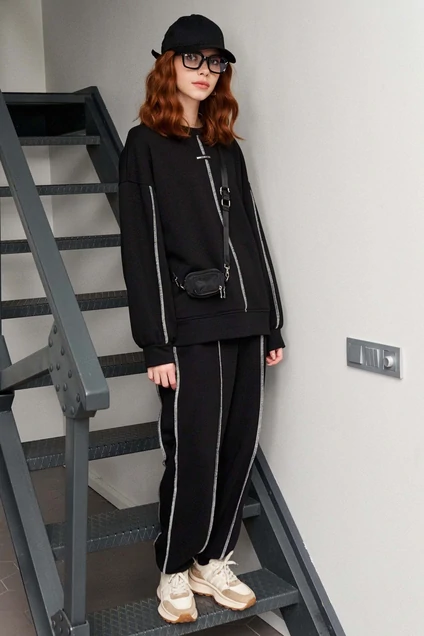 Костюм спортивный состоит из кофты и брюк. Линия плеча спущена, по низу рукава притачная манжета. Округлый вырез горловины обработан бейкой. По центру переда, спинке и рукаву вертикальные наружные швы, обработанные отделочной ниткой. Нашивки по переду и спинке. Брюки с притачным поясом на резинке, в боковых швах карманы. По низу притачная манжета, собранная на резинку. Вертикальные подрезы со швами наружу, обработанные отделочной ниткой.