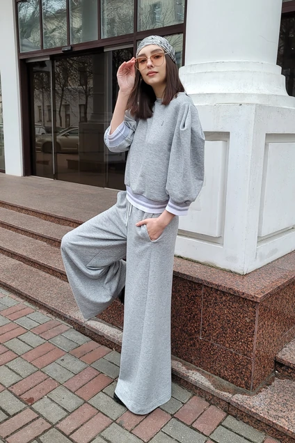 Костюм спорт. Кофта свободного кроя по низу сосборена на довяз, рукав втачной, у основания со складками по низу рукава сосборен на довяз. По переду округлый вырез горловины обработан планкой.