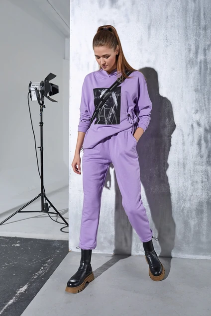 Свитшот свободного кроя со спущенной линией плеча.Перед с печатью,кулисами на уровне талии,декоративной резинкой и фиксаторами.Брюки прямого силуэта на притачном поясе с резинкой и кулисой с фиксатором и резинкой по низу. длина изделия по спинке - 63см