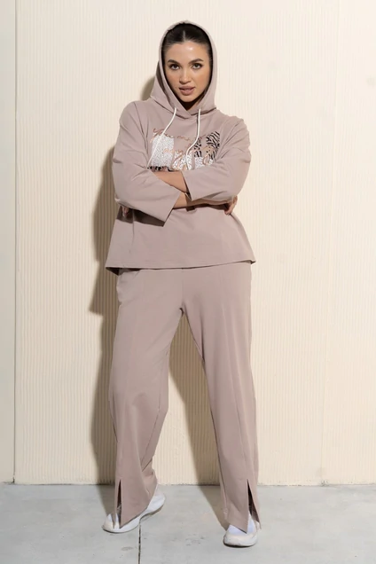 Спортивный костюм актуального кроя из трикотажного футерованного полотна.Свитшот прямого силуэта с капюшоном,со спущенной линией плеча,рукав 3/4.По переду-печать.Брюки высокой посадки на притачном поясе с резикой,по боковому шву-карманы,по переду с разрезами по центру. длина по спинке-60см