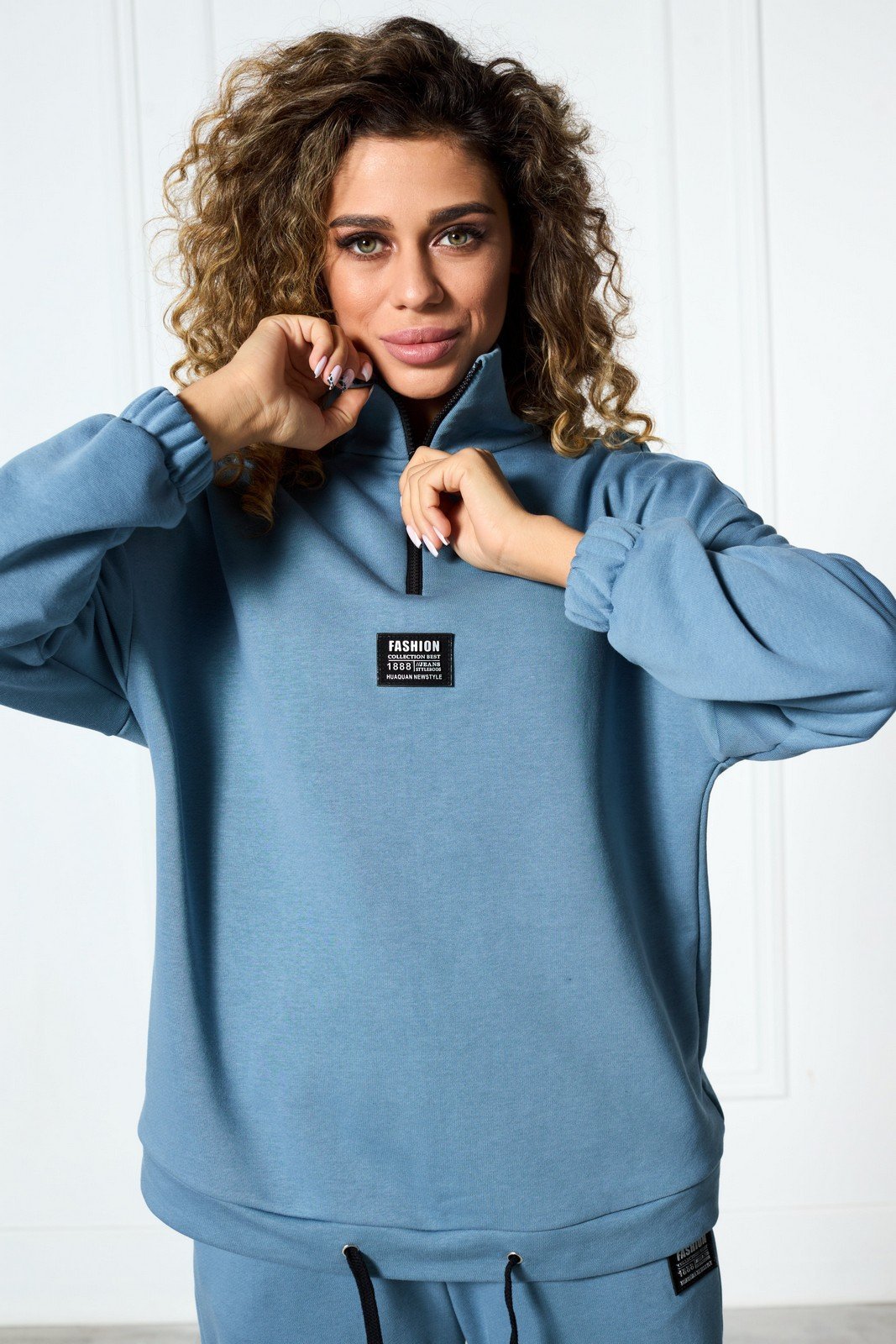 Свитшот прямого силуэта со спущенным плечом. Горловина оформлена стойкой на застежке «молния».