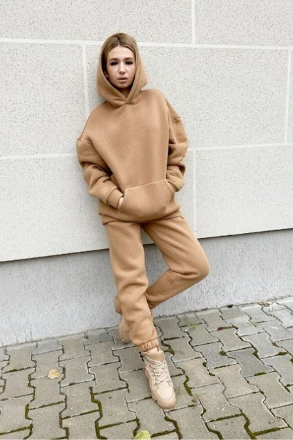 В костюм входят худи и брюки свободного кроя. Худи с накладным карманом кенгуру, спущенной линией плеча, капюшоном и поясом по кругу.Рукава длинные, одношовные с манжетами по низу. Брюки с притачным поясом на резинке, на передних половинках брюкобработаны карманы с отрезными бочками. Низ брюк заканчивается манжетами на резинках.