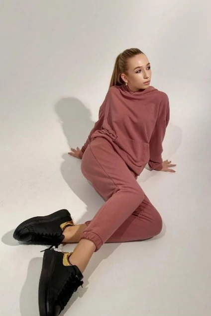 В костюм входят худи и брюки свободного кроя. Худи с накладным карманом кенгуру, спущенной линией плеча, капюшоном и поясом по кругу.Рукава длинные, одношовные с манжетами по низу. Брюки с притачным поясом на резинке, на передних половинках брюкобработаны карманы с отрезными бочками. Низ брюк заканчивается манжетами на резинках.