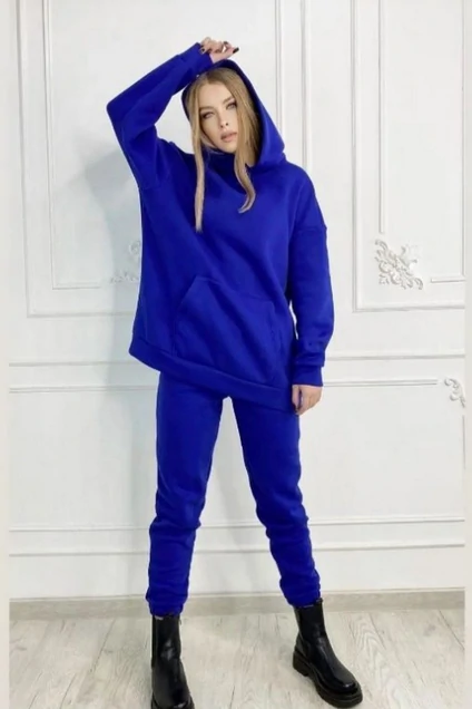 В костюм входят худи и брюки свободного кроя. Худи с накладным карманом кенгуру, спущенной линией плеча, капюшоном и поясом по кругу.Рукава длинные, одношовные с манжетами по низу. Брюки с притачным поясом на резинке, на передних половинках брюкобработаны карманы с отрезными бочками. Низ брюк заканчивается манжетами на резинках.