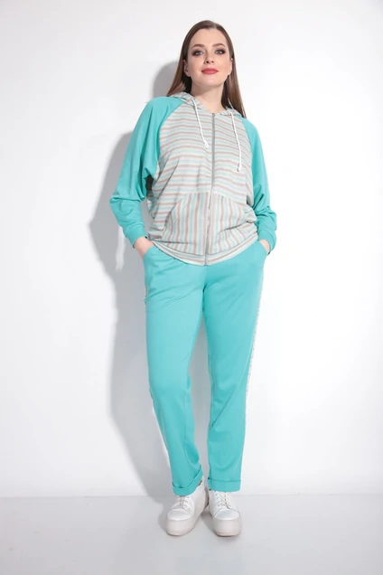 Универсальный женский костюм в спортивном стиле станет незаменимым для вашего гардероба. Толстовка на молнии выполнена из плотного трикотажа, по переду и спинке мягкая и очень приятная на ощупь хлопковая ткань футер в полосочку с добавлением люрексовой нити, что делает костюм невероятно нарядным. Капюшон также выполнен из полосатого футера. Рукав реглан имеет глубокую пройму, что украшает данную модель и делает ее носку более комфортной.