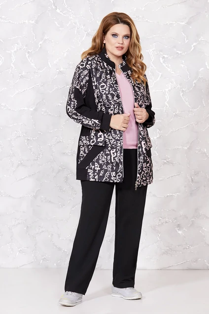 Трех- предметный спортивный костюм состоит из спортивной кофты, брюк и майки. Спортивная кофта выполнена из трикотажной ткани (стрейч) и плащевки в качестве отделки. Горловина обработана стойкой из трикотажа и плащевки, застежка на тесьму-молнию, полочка с подрезом по линии талии и втачной кулисой из плащевки. Так же на полочке обработаны рельефы, бачок из трикотажной ткани ниже, линии талии накладные карманы из плащевки, с отделкой трикотажа, и клапаном. Рукав втачной, низ на трикотажной манжете и вставкой из трикотажа ниже линии локтя. Спинка с подрезом по линии талии и вставкой кулисы из плащевки, спинка из трикотажв и плащевки. Брюки выполнены из трикотажа, прямого покроя, верхний срез обработан притачным поясом на резинке, на переднем полотнище брюк обработаны карманы. Майка выпоонена из вискозы, с V-образным вырезом горловины и нагрудными вытачками, рукав втачной, укароченный. В 60р. Длина куртки по спинке 77см, длина рукава куртки 74см, длина майки по спинке 67см, длина рукава майки 23см, ширина рукава майки 21,5см, длина брюк по боковому шву 104см, по внутреннему шву 77см. Куртка (в 60р). Ширина груди 65см, Ширина бедер 67см, Ширина талии 64см, длина рукава 74см, ширина рукава 24см. Майка: Ширина груди 61см, Ширина бедер 64см, длина рукава 23см, ширина рукава 21,5см, Брюки: Ширина талии 46см, Ширина бедер 64см