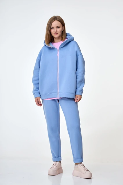 Костюм из приятного трикотажа с начёсом, наивысшего качества - пенье. Худи свободного силуэта, на молнии, с высоким воротом и капюшоном. В боковых швах карманы. Брюки с карманами в боковых швах. Пояс брюк с резинкой внутри. По переду имитация застежки. Цвет небесно-голубой