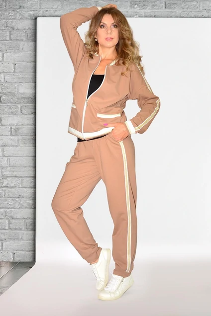 Жакет (бомбер) женский из трикотажного полотна - мягкий эластичный однотонный футер двухнитка из хлопковой пряжи. Жакет полуприлегающего силуэта, повседневный и спортивный, со спущенным рукавом, с центральной застежкой молнию. Перед с накладными карманами с листочкой из трикотажного довяза. Спинка цельная. Рукава спущенные одношовные длиные, с настроченной по линии середины декоративной тесьмой, с притачной манжетой по низу из трикотажного довяза. По горловине обработана бейка из трикотажного довяза. По низу изделия обработан пояс из трикотажного довяза.