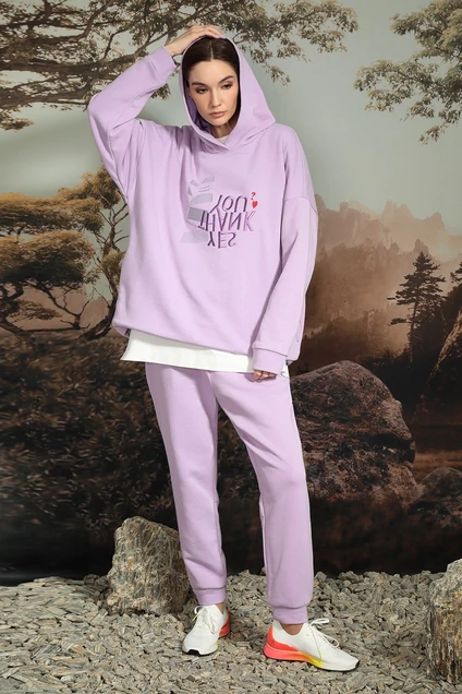 Свитшот и брюки выполнены из трикотажного итальянского полотна 3-нитка. Объемный удлиненный свитшот, карманы в боковых швах, длинный рукав на манжете. Брюки на резинке, карманы в боковых швах. Майка объемная. Рукав короткий. Дизайнерская вышивка на свитшоте и печать на майке.