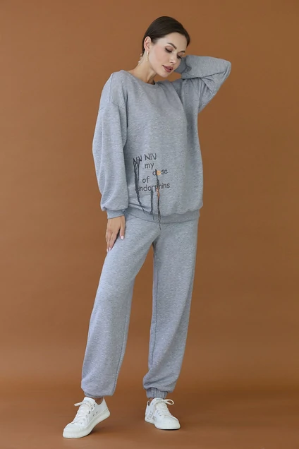 Стильный и практичный спортивный костюм, состоящий из свитшота и брюк. Удлиненная объемная толстовка в стиле Sportshik из хлопкового футера 3-нитки со спущенной линией плеча. Свободный, длинный рукав со складками по окату. Низ рукава на манжете. Низ изделия на притачной планке из отделочной ткани. Горловина круглая, с притачной планкой из отделочной ткани. Спинка прямая. На полочке и спинке дизайнерская вышивка. Спортивные брюки из хлопкового футера 3-нитки, свободного непринужденного кроя. На передних половинках кармашки и эластичный широкий пояс-резинка, в который вставлен декоративный шнур. На задних половинках брюк накладные карманы. Низ брюк на резинке.
