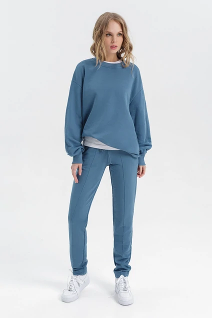 Трикотажный костюм-двойка из свитшота свободного покроя и брюк с защипами. Детали: свитшот прямого силуэта, перед и спинка с широким притачным поясом, спущенная линия плеча, рукава длинные с притачными манжетами. Брюки с высокой посадкой, притачной эластичный пояс, карманы в боковых швах
