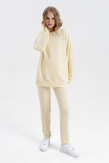 Трикотажный костюм-двойка из свитшота свободного покроя и брюк с защипами. Детали: свитшот прямого силуэта, перед и спинка с широким притачным поясом, спущенная линия плеча, рукава длинные с притачными манжетами. Брюки с высокой посадкой, притачной эластичный пояс, карманы в боковых швах