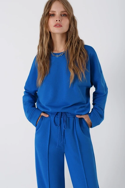 Трикотажный костюм-двойка из свободного свитшота и прямых брюк. Детали: свитшот прямого силуэта, спущенная линия плеча, рукава длинные с притачными манжетами, низ переда и спинки с необработанным краем. Брюки с высокой посадкой на притачном эластичном поясе, карманы в боковых швах, стрелками-защипы по передним частям брюк