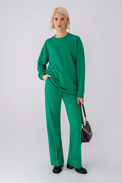 Трикотажный костюм-двойка из свободного свитшота и прямых брюк. Детали: свитшот прямого силуэта, спущенная линия плеча, рукава длинные с притачными манжетами, низ переда и спинки с необработанным краем. Брюки с высокой посадкой на притачном эластичном поясе, карманы в боковых швах, стрелками-защипы по передним частям брюк