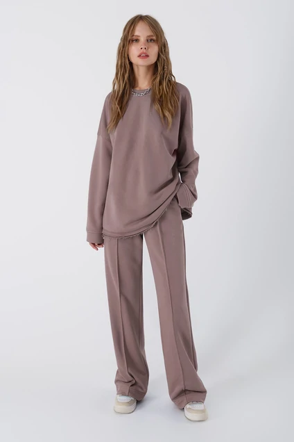 Трикотажный костюм-двойка из свободного свитшота и прямых брюк. Детали: свитшот прямого силуэта, спущенная линия плеча, рукава длинные с притачными манжетами, низ переда и спинки с необработанным краем. Брюки с высокой посадкой на притачном эластичном поясе, карманы в боковых швах, стрелками-защипы по передним частям брюк