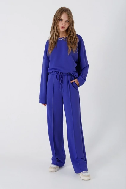 Трикотажный костюм-двойка из свободного свитшота и прямых брюк. Детали: свитшот прямого силуэта, спущенная линия плеча, рукава длинные с притачными манжетами, низ переда и спинки с необработанным краем. Брюки с высокой посадкой на притачном эластичном поясе, карманы в боковых швах, стрелками-защипы по передним частям брюк