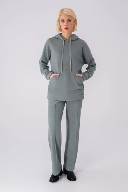 Трикотажный костюм-двойка из худи и прямых брюк. Детали: худи прямого силуэта, спущенная линия плеча, рукава длинные, накладной карман, капюшон. Брюки с высокой посадкой на притачном эластичном поясе, карманы в боковых швах, стрелки-защипы по передним частям брюк