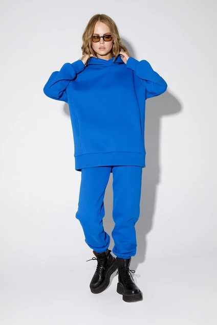 Утепленный трикотажный костюм-двойка из свободного худи и брюк-джоггеров. Детали: худи свободного покроя, спущенная линия плеча, перед с карманами в рельефных швах, капюшон, широкий притачной пояс, рукава длинные с притачными манжетами. Брюки с высокой посадкой на эластичном поясе, карманы в боковых швах, низ брюк на резинке