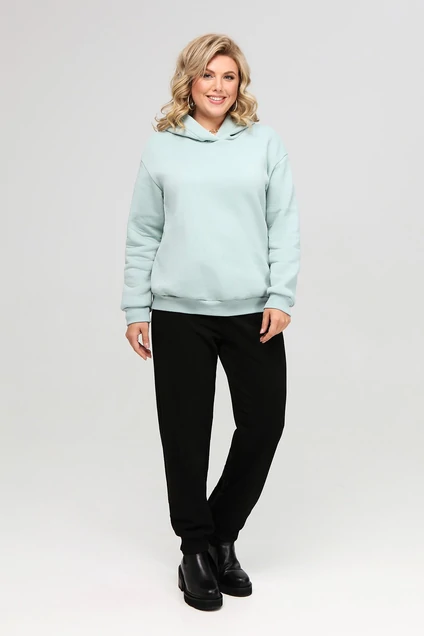 Женский прогулочный костюм, состоящий из джоггеров и худи. Выполнен костюм из мягкого уютного трикотажа. Худи свободного кроя, с притачным поясом из кашкорсе по низу. Рукав втачной, со спущенной линией плеча. По низу рукава есть притачная манжета из кашкорсе. Длина изделия по спинке 71 см. Длина рукава 63 см.