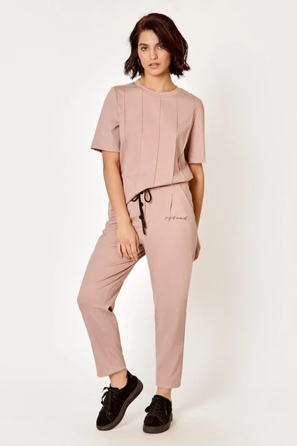 Костюм спортивного стиля состоит из футболки и брюк. Футболка прямого силуэта, с круглым вырезом и втачным рукавом. На полочке вертикальные декоративные защипы-строчки. Брюки свободного силуэта, заужены к низу. Брюки на поясе со шлевками, регулируется шнуром с наконечниками. Застежка брюк на декоративных пуговицах. На переднем полотнище карманы, на одном из них авторская печать. На задних полотнищах – карманы-листочки Длина футболки - 61 см, длина рукава. Брюки - 100см.