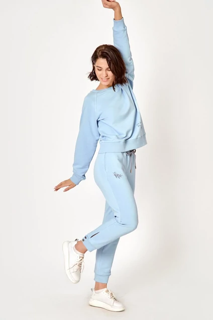 Костюм женский спортивного стиля состоит из свитшота и брюк. Свитшот свободного силуэта. Горловина, манжеты выполнены из трикотажного полотна «кашкорсе» в тон основной ткани. На полочке авторская печать. Брюки свободного силуэта внизу на манжете с декоративными пуговицами. Пояс на резинке, регулируется шнуром с наконечнками. В боковых швах карманы. На одном из карманов авторская печать. Длина джемпера - 58 см, брюк - 102 см. Длина рукава от горловины - 72 см.