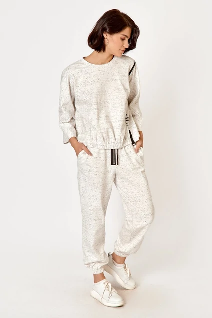 Костюм женский спортивного стиля состоит из свитшота и брюк. Свитшот свободного силуэта. Горловина круглая, рукав ¾. Низ свитшота на резинке. На переднем полотнище отделка тесьмой с металлическим полукольцом, а также авторская печать. Брюки свободного силуэта внизу на резинке. Пояс на резинке, регулируется шнуром с наконечниками. По переду декоративная молния Длина джемпера - 62 см, брюк - 97 см. Длина рукава - 60 см.