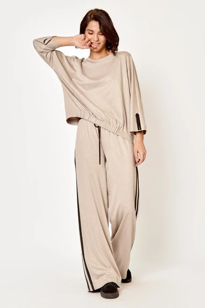 Костюм женский спортивного стиля состоит из свитшота и брюк. Свитшот свободного силуэта. Горловина круглая, рукав ¾. Низ свитшота на резинке. На рукаве отделка тесьмой с металлическим полукольцом. Брюки свободного силуэта типа «палаццо». Пояс на резинке, регулируется шнуром с наконечниками. Карманы в боковых швах. Вдоль боковых швов отделка тесьмой Длина футболки - 62 см, длина рукава - 61 см. Длина брюк - 97см.
