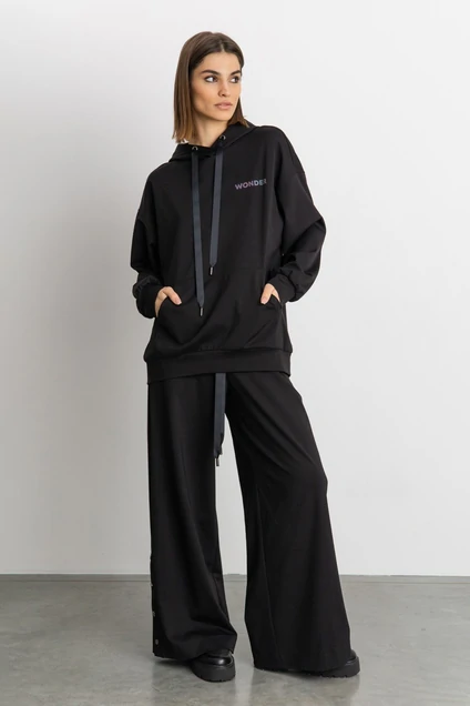 Костюм: худи+брюки. Худи свободного кроя со спущенной линией плеча. Горловина с капюшоном, капюшон с завязкой-стяжкой из репсовой ленты. По передней полочке внизу по центру накладной карман и авторская печать по груди слева. По низу худи планка. Рукав на манжете. Брюки палаццо. Пояс широкий на резинке со стяжкой из репсовой ленты. Карманы с наклонным входом. Низ брюк со шлицей с кнопками.