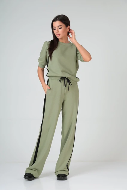Костюм спорт-шик женский 2-х предметный. Свитшот с коротким одношовным втачным рукавом на манжете, с встречными складками по окату. В боковых швах широкие лампасы. Горловина округлой формы не глубокая. Низ свитшота на резинке. Брюки прямые, в боковых швах лампасы, так же в боковых швах имеются карманы. Пояс на резинке, с декоративным шнуром. длина брюк 109 см Рукав: короткий
