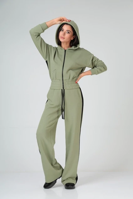 Костюм спорт-шик 2-х предметный. Куртка укороченая с одношовный рукавом на манжете. Плечо спущеное. Низ изделия на резинке. Застежка на молнию. Спинка прямого силуэт. Капюшон двойной свободный.
