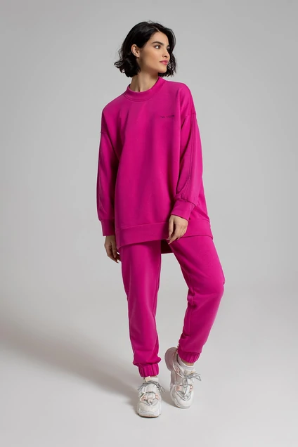 Комплект, состоящий из свитшота и брюк. Свитшот прямого силуэта, длиной ниже бёдер, с неровной линией низа (спинка длиннее). По переду в области груди слева декоративная вышивка. По низу притачная манжета. Горловина округлой формы, обработана притачной планкой. Линия плеча спущена, рукава длинные, с притачной манжетой по низу. Рукава с верхним и нижним швами. Брюки в спортивном стиле, длиной ниже щиколотки. Брюки на резинке по талии, с боковыми карманами с наклонным входом. По низу подгибка, в которую вставлена широкая резинка. В пояс втянут декоративный шнур. Слева снизу на левой передней половинке брюк декоративная вышивка.
