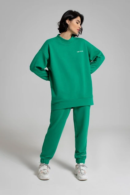 Комплект, состоящий из свитшота и брюк. Свитшот прямого силуэта, длиной ниже бёдер, с неровной линией низа (спинка длиннее). По переду в области груди слева декоративная вышивка. По низу притачная манжета. Горловина округлой формы, обработана притачной планкой. Линия плеча спущена, рукава длинные, с притачной манжетой по низу. Рукава с верхним и нижним швами. Брюки в спортивном стиле, длиной ниже щиколотки. Брюки на резинке по талии, с боковыми карманами с наклонным входом. По низу подгибка, в которую вставлена широкая резинка. В пояс втянут декоративный шнур. Слева снизу на левой передней половинке брюк декоративная вышивка.