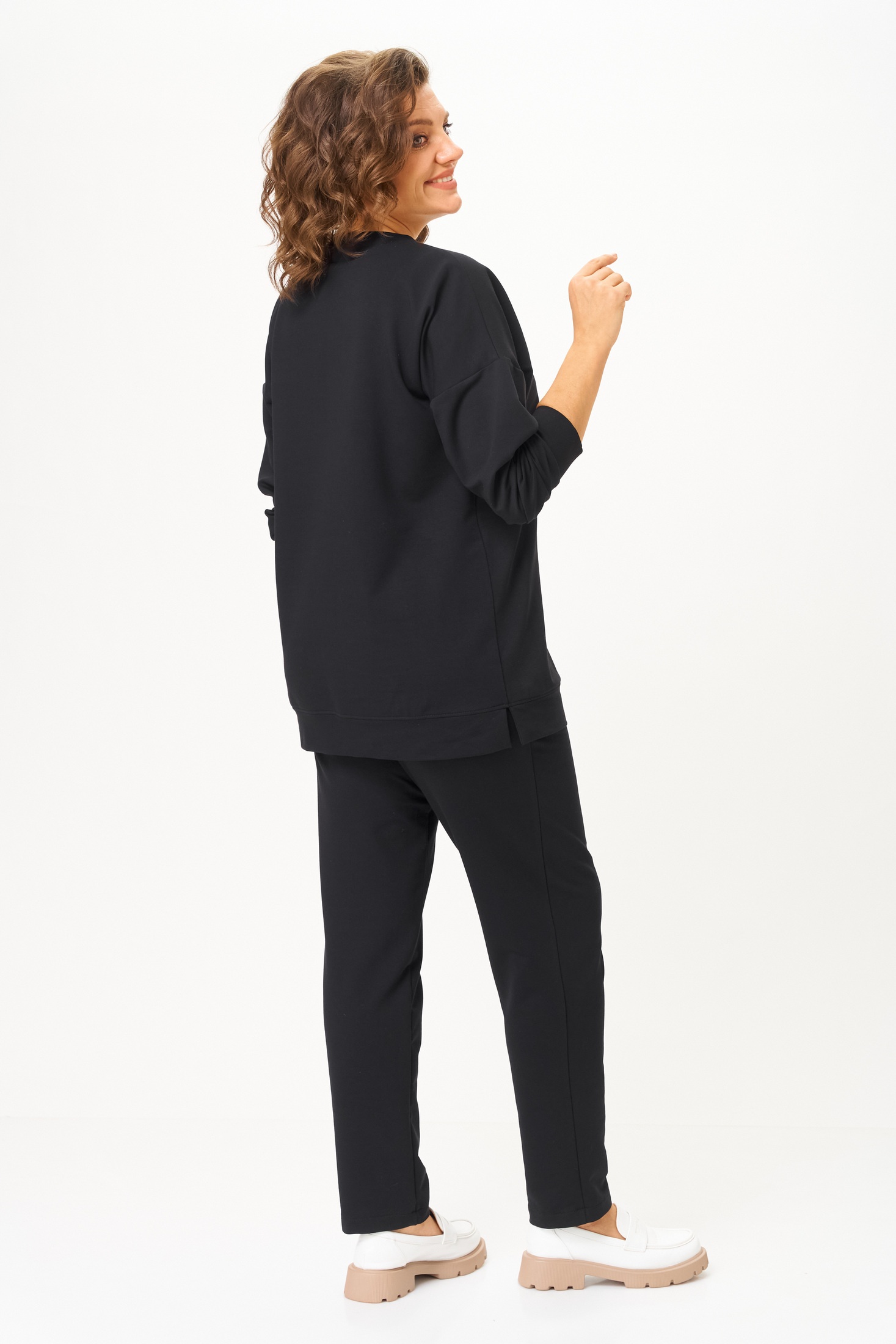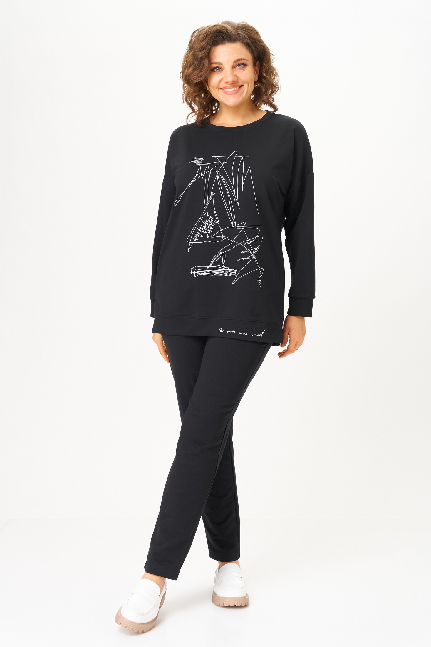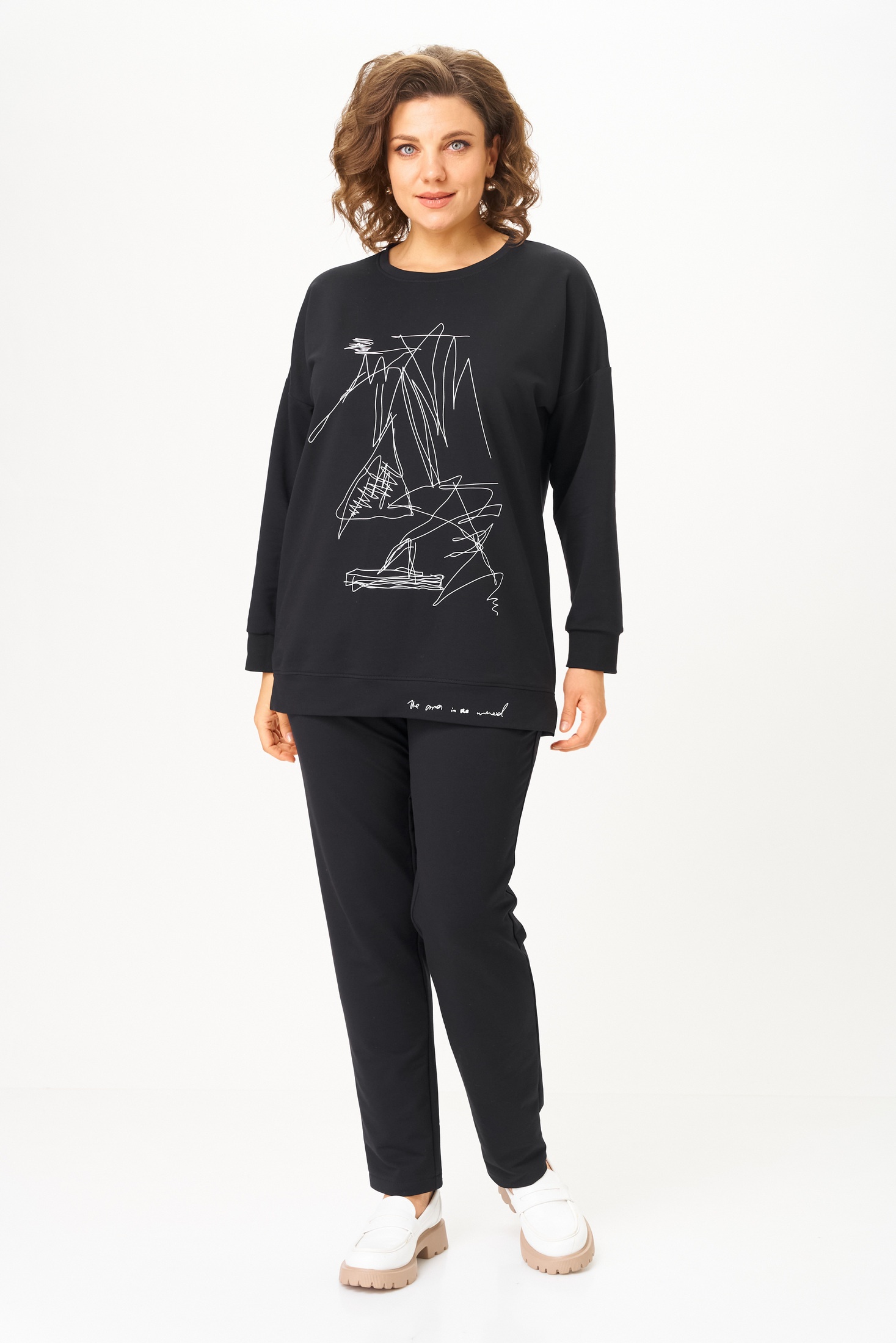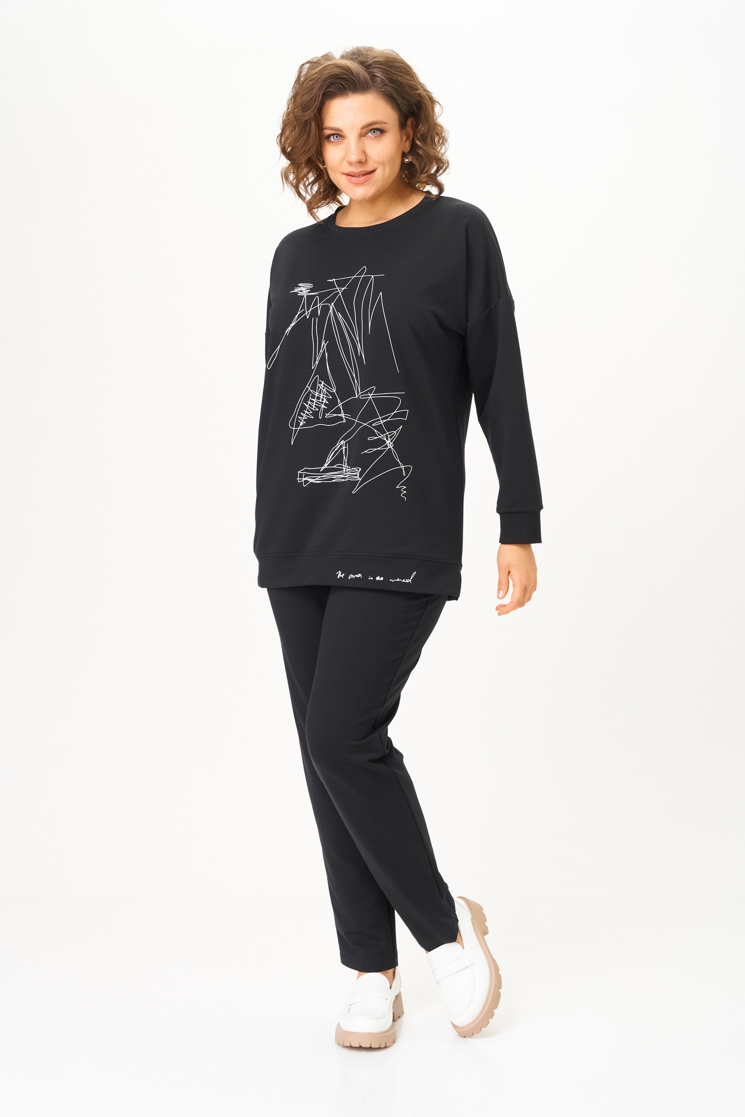 Спортивный костюм 2061-2 черный STEFANY — идеальный выбор для современной женщины, ценящей комфорт и стиль. Коллекция бренда STEFANY предлагает черный комплект из свитшота и брюк, выполненный из мягкого хлопка с добавлением спандекса для эластичности. Свитшот с длинным спущенным рукавом и круглой горловиной украшен стильной печатью, а зауженные брюки оснащены удобными карманами и поясом на резинке. Комплект обеспечивает комфорт в любое время года, идеально подходит для прогулок или домашнего отдыха. Длина свитшота составляет 72 см, что добавляет дополнительное удобство в повседневной носке.