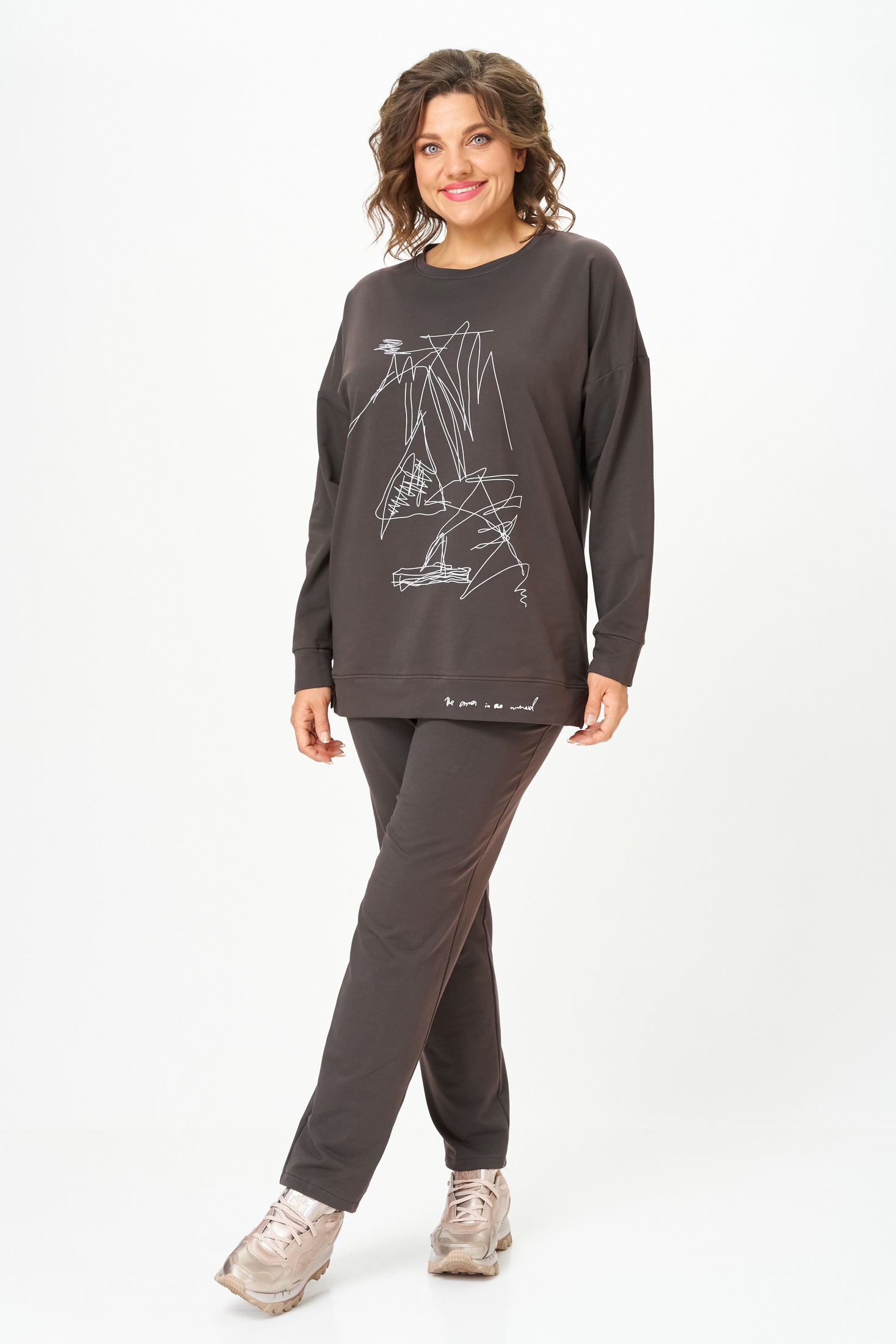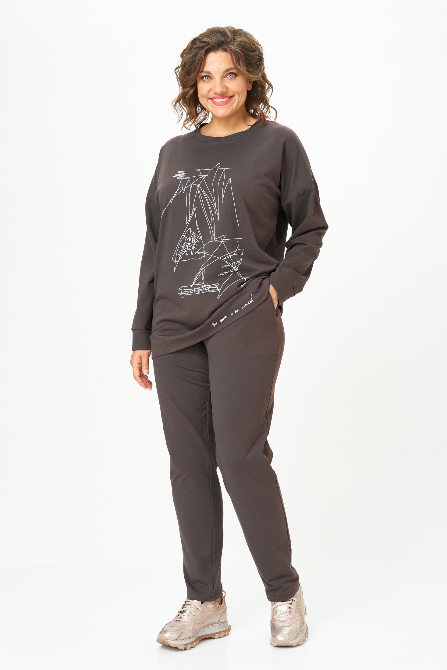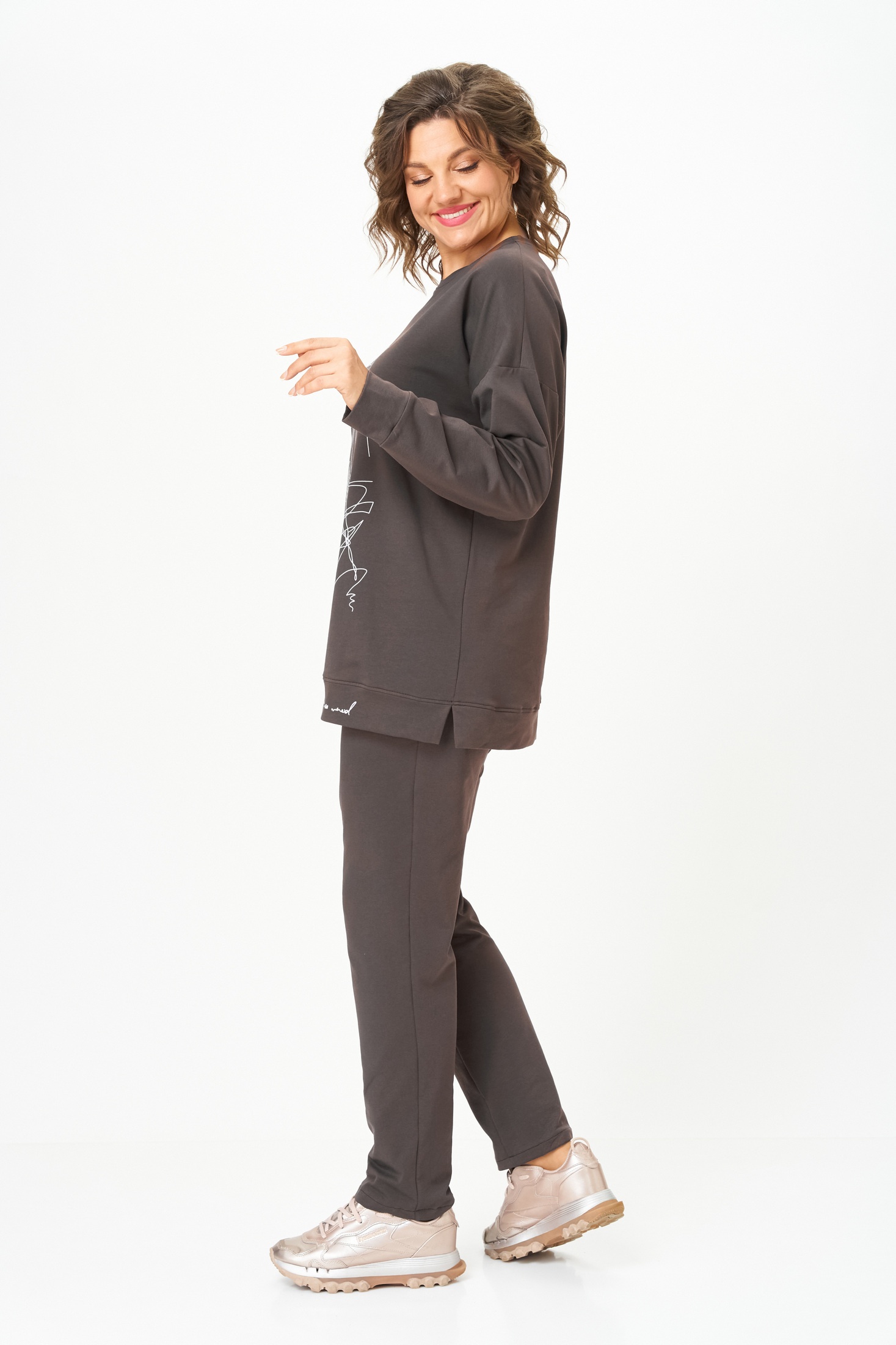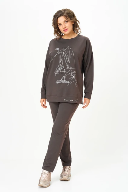 Комплект женской одежды, включающий в себя свитшот и брюки, выполнен в тёмно-коричневом цвете. Свитшот обладает удлинёнными спущенными рукавами на манжетах, округлой горловиной, а в качестве декоративного элемента присутствует графический белый принт на передней части. Брюки оформлены зауженными к низу, имеют боковые карманы и удобный эластичный пояс. Этот спортивный костюм подходит для случаев, когда необходим комфорт в сочетании со стильным дизайном.