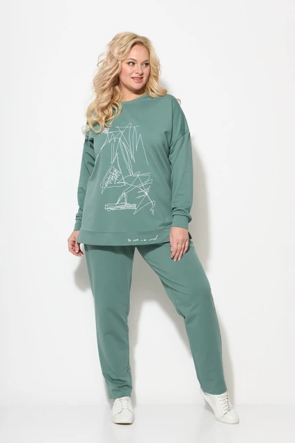 Комплект женский, двухпредметный, состоящий из свитшота и брюк. Свитшот с длинным спущенным рукавом, по полочке и по низу планки-печать. Круглая горловина, рукав на манжете.Брюки зауженные к низу, в боковых швах карманы, пояс на резинке.