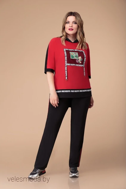 Костюм женский, состоящий из туники и брюк. Туника прямого силуэта с цельнокроеным рукавом длиной до локтя. Низ рукава на притачной манжете в цвет спинки. Полочка туники контрастного цвета декорирована аппликацией и отделочной тесьмой. По горловине туники капюшон. Брюки прямые. Пояс на резинке. По боковому шву брюк настрочен лампас в цвет переда туники. Длина брюк с поясом в 58 размере 106 см. Ширина брюк на уровне бедер 59 см. Длина туники по центру спинки 83 см. Длина рукава 45 см.